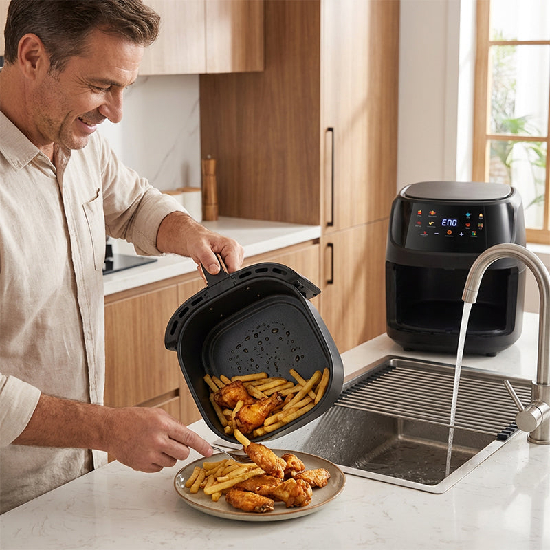 ¡Más tiempo para disfrutar, menos para limpiar! La canasta desmontable con revestimiento antiadherente se limpia rápidamente después de cada uso. ¡Solo enjuaga y listo! 🧼🚿