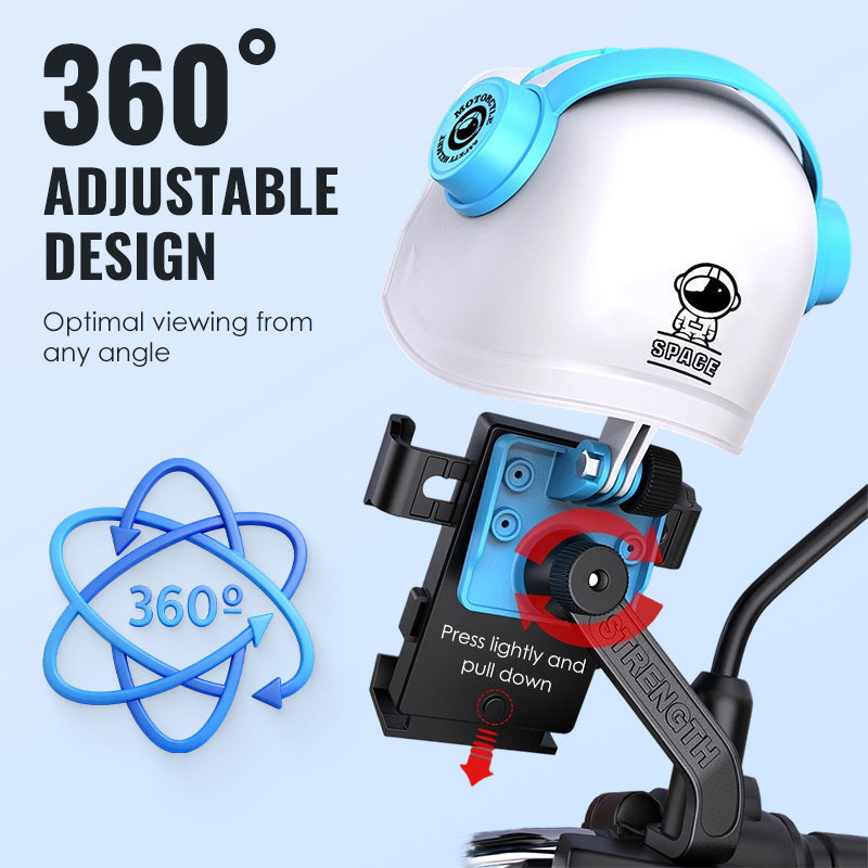 🛡️ CASCO PROTECTOR INTEGRADO: ¡Protege contra la lluvia y el sol - siempre visión clara! El casco de forma única y divertida protege su teléfono de condiciones climáticas adversas y luz solar directa. Este diseño bien pensado proporciona sombra confiable y protección contra la lluvia, manteniendo la pantalla visible y su dispositivo seguro durante aventuras al aire libre. ☀️🌧️